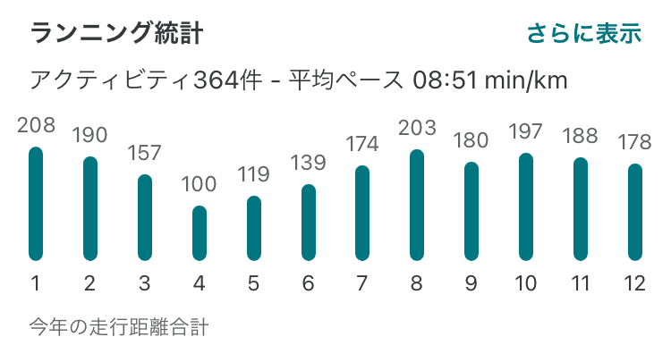 グラフを見て頂いて分かる通り、僕はどんなに少なくとも、毎月170km~180kmの距離は走っていると思うんですが、今年が3月~6月の4ヶ月間の記録が著しくありません。
